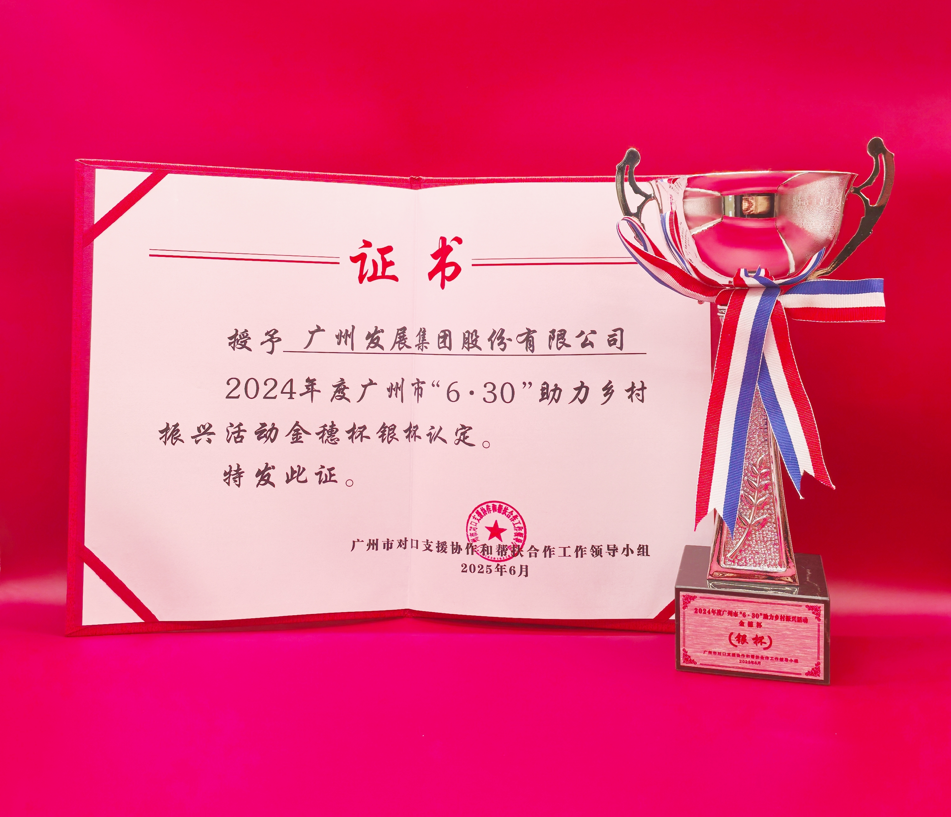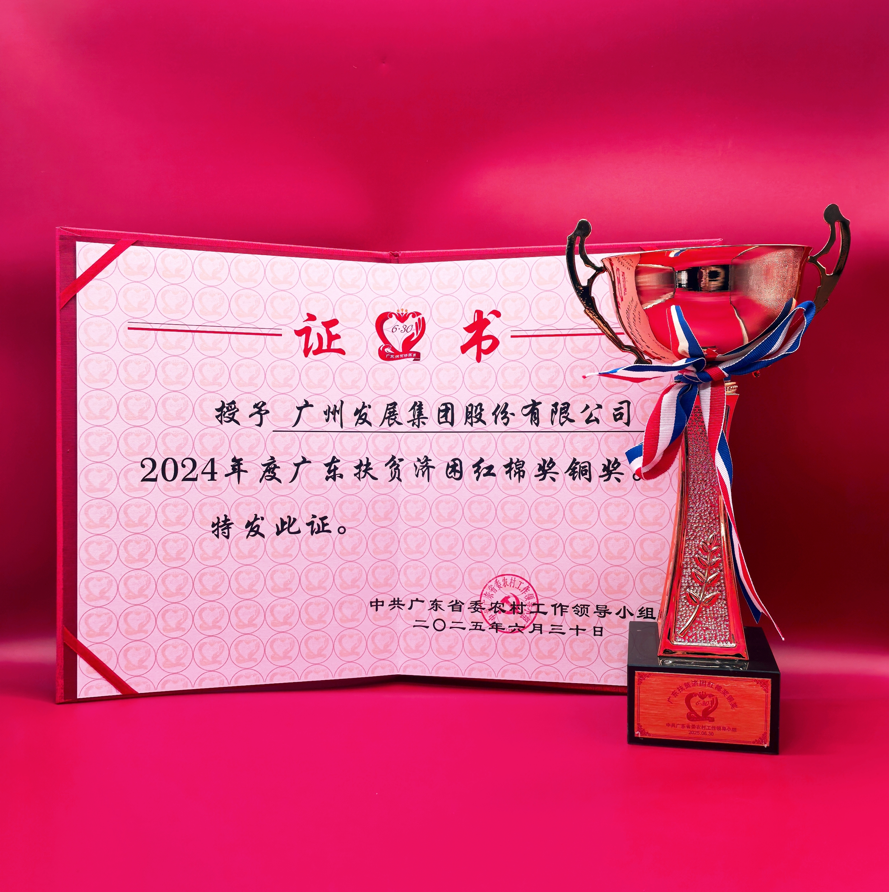 近日,太阳集团网址凭借在助力乡村振兴、村企共建、赈灾救援、环境绿化等方面的突出贡献,荣获“2024年度广东扶贫济困红棉杯铜杯”“2024年度广州市‘6·30’助力乡村振兴金穗杯银杯”两项奖项。