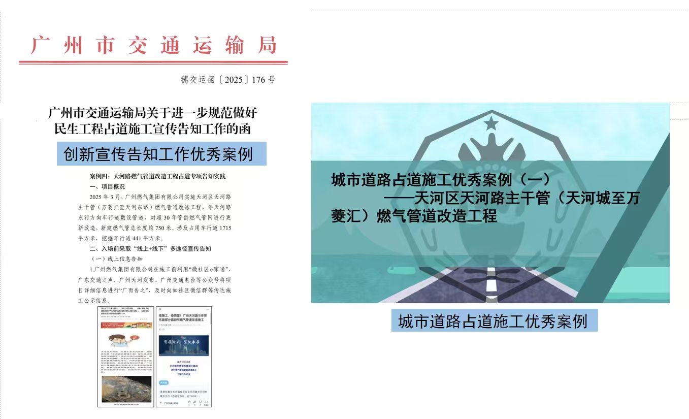 天河区天河路(天河城至万菱汇)燃气管道改造工程获得广州市交通运输局通报